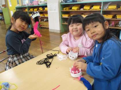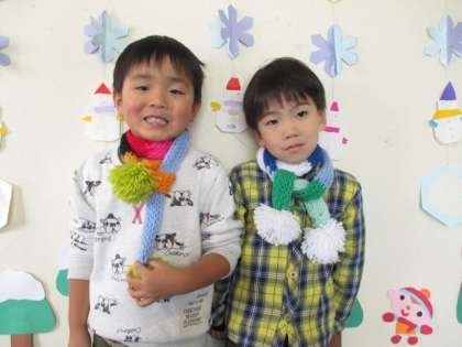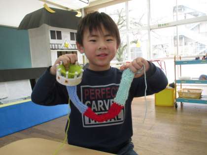 マフラーづくりに挑戦しました。一つ一つ編んでいくのは、根気のいる作業ですが、子供たちは集中して編んでいました。少しずつマフラーが長くなると喜んで首にまいて長さを確認する姿が見られました。完成したマフラーをまいて「あったかい」と嬉しそうに見せてくれました。
