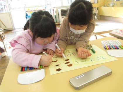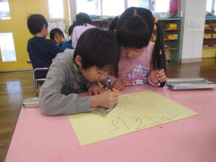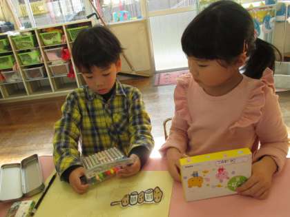 先日から準備をしてきた「たこやき」「やきそば」「やきとり」「ジュース」のお店を開店しました。サークルのお友達が遊びに来てくれました。「いらっしゃいませ」「おいしいですよ」と、大きな声でお客さんに声をかけていました。何度も買い物にきてくれたことがうれしく「忙しかったけど楽しかった」「いっぱいジュース買ってくれたね」などと話をしていました。来週は、年長組を誘ってお店屋さんを楽しみにたいと思います。