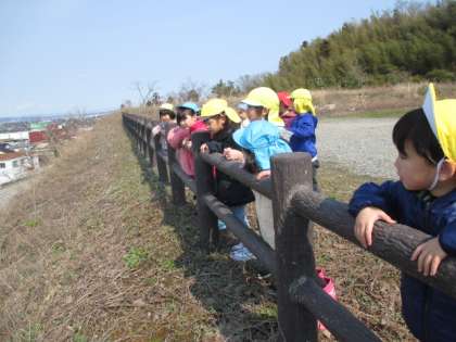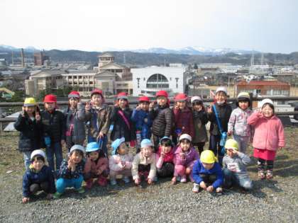 今日は、天候が良かったのでみんなで散歩に行ってきました。ノーベル街道の石碑がある広場まで行ってきました。幼稚園や小学校が見えると喜んでいました。その後、稲荷神社まで行きブランコをしたり鬼ごっこをしたりして楽しんできました。