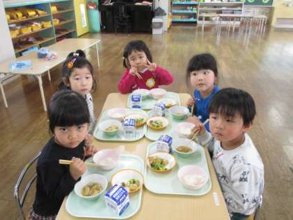 みんなが楽しみにしていた給食が始まりました。今日は、ひまわり組とたんぽぽ組で一緒に食べました。いろいろな話をしながらたくさん食べました。
