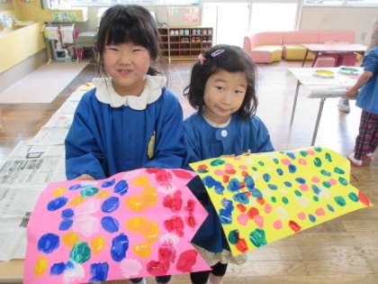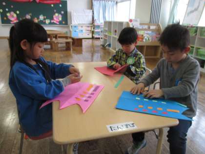 もうすぐこどもの日ということで、こいのぼりをつくっています。ひまわり組はデカルコマニーをして素敵な模様になり大喜びでした。うさぎ組は、いろいろな色の画用紙を編み込んでカラフルな模様をつくりました。集中して編み込み、慣れてくると上手に編み込めるようになりました。