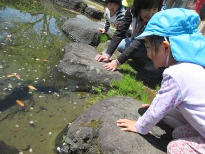 帰りには小学校の池のオタマジャクシを見てきました。「あそこにいるよ!」とオタマジャクシを見つけて大喜びの子供たちでした。