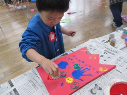 カラー段ボールやプチプチ、毛糸などいろいろな素材を使ってスタンプをしました。「ギザギザになったよ!」「かわいいでしょ!」と言いながら素敵なこいのぼりをつくりました。