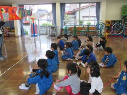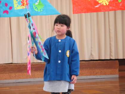 自分のつくった鯉のぼりをもって集会に参加した子供たち。紙芝居を見ながらこいのぼりの由来を聞いたり、自分の鯉のぼりを紹介したりしました。「編み込むのが難しかったけど頑張ったよ」「スタンプ楽しかったよ」と代表のお友達がお話ししてくれました。