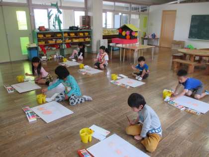 楽しかった立山青少年自然の家での思い出を写真を見たり友達と話をしたりしながら遠足の絵を描きました。「水ってどんな色だったかな」と言って混色してみたり、細かいところを筆を使って真剣に塗ったりしました。いろいろな色の絵の具を使って描くことをとても楽しんでいました。