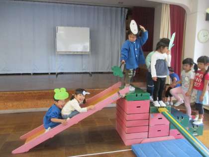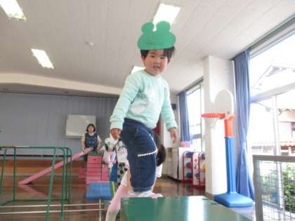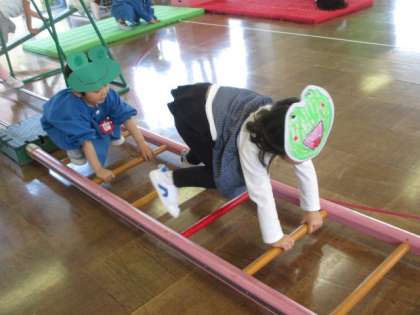 立山青少年自然の家での遠足で遊んだ、りすの一本道をつくりたい!と、うさぎ組がイメージを出し合いながら作ると、たんぽぽ、ひまわり組も「僕(私)も遊びたい!」と遊びに加わってみんなで楽しんでいました。高さが高い一本橋も、うさぎ組さんがたんぽぽ組の友達と手を繋ぎ「もう少しだよ。」と優しく声をかけてくれて渡ることが出来ました。これからもみんなで体を動かして遊んでいきたいと思います。