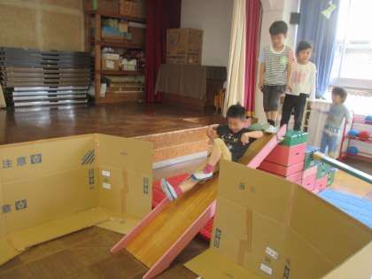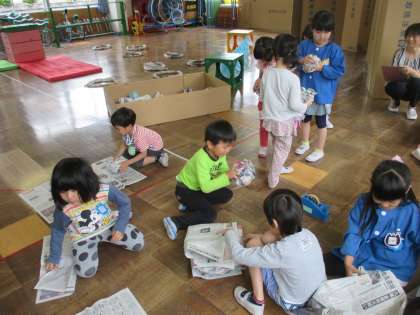 うさぎ組の子供たちは「石の滑り台をつくりたい」と家から新聞をたくさん持ってくると「新聞の山になったね!」と言って石の滑り台の石づくりをしました。ひまわり組も「キャンディーみたいな石になったよ」などと言いながら一緒に石をつくりました。そのあとにたんぽぽ組も加わって遊びました。
