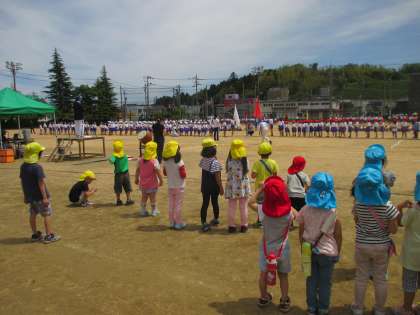 大沢野小学校が運動会の予行練習をしていました。幼稚園の子供たちもグラウンドに出て、騎馬戦や綱引きなど「がんばれ〜!」と大きな声で応援しました。