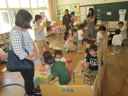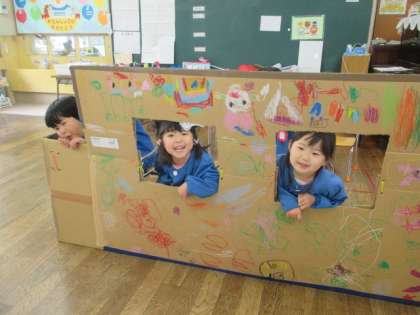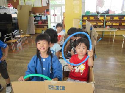 たんぽぽ・ひまわり組では、段ボールに好きな絵を描いて大きなバスを作りました。「バスに乗って揺られてる〜 ゴ〜ゴ〜!」と歌を歌いながらバスごっこを楽しんでいます。今日は親子サークルの友達が遊びに来てくれて嬉しそうな子供たちでした。