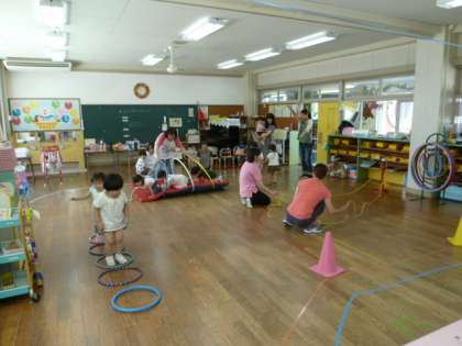 マットやフープを使った面白いサーキット遊びで、いろいろな体の動かし方を教えてもらいました。