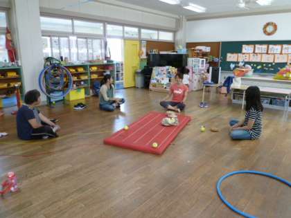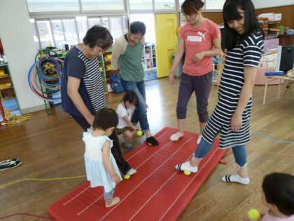 子供たちとお家の方たちのふれあいタイムが終わった後は、お家の方たちのリフレッシュタイムです。いつもがんばるお母さんやおばあちゃんたちの体の疲れをとるようなゆったりとした運動を教えていただきました。