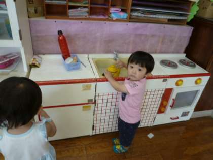 その間の子供たちは・・ままごとコーナーでごちそう作りです!