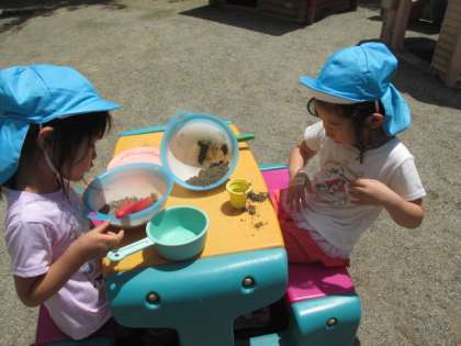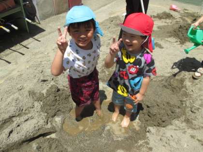 たんぽぽ、ひまわり組は久しぶりに水遊びをしました。ままごとでケーキをつくったり、穴を掘って温泉をつくったりすることを楽しみました。
