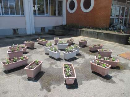うさぎ組はみんなで植えた花のプランターを太陽の形をイメージし、力を合わせて並び替えました。