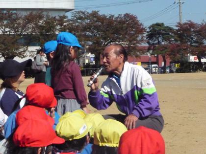おんまはみんなの歌を歌い、乗馬クラブの校長先生に馬について質問をしました。「どうして馬の頭に毛が生えているのですか」「みんなと同じで頭を守っているんだよ」「どうして馬の足音はパカパカいうのですか」「足の爪が削れて痛くなるのでかねの靴を履いているからだよ」と優しく教えてくださいました。年長児は馬の背に乗せてもらい、年中・年少児は馬にニンジンをあげました。子ども達はとても楽しかったようで、馬を乗せたトラックが見えなくなるまで手を振っていました。