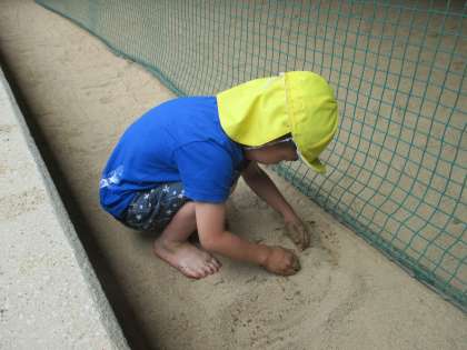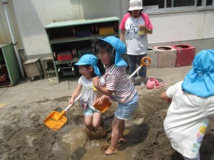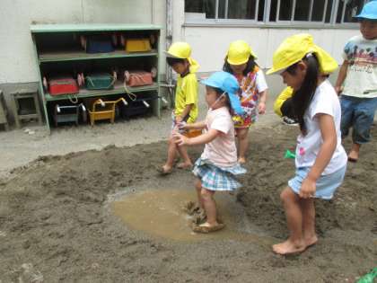 たんぽぽ、ひまわり組は、みんなで土を掘って大きな川を作り、水を流して遊びました。堀った土が積み重なったところを「山みたい!」と言って山に見立てると山の頂上から川に飛び込むことを楽しんでいました。
