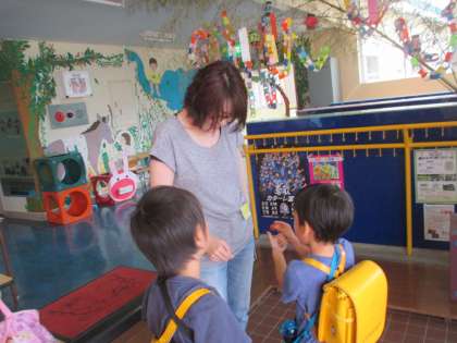 今日は、「赤いトマトなってる!!」と美味しそうに実った真っ赤なトマトを園長先生に嬉しそうに見せる友達がいました。収穫第一号です!!
