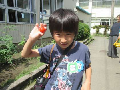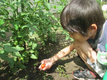 「先生、来て!」ミニトマトが赤く実ったことが嬉しくて仕方がない様子で報告に来ました。食べてみると「甘い〜!」と喜んでいました。
