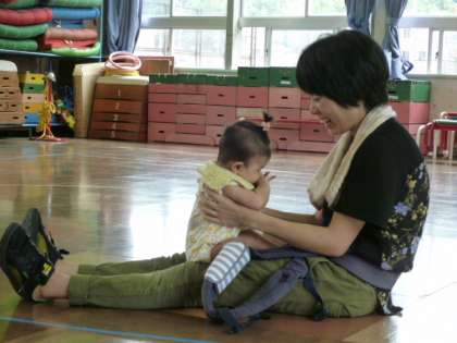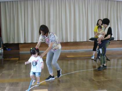 遊戯室で在園の3歳児さんも参加させてもらって、リトミック遊びを行いました。曲に合わせて手をたたいたり、転がったり。お家の方と一緒に汗びっしょりなって楽しみました。