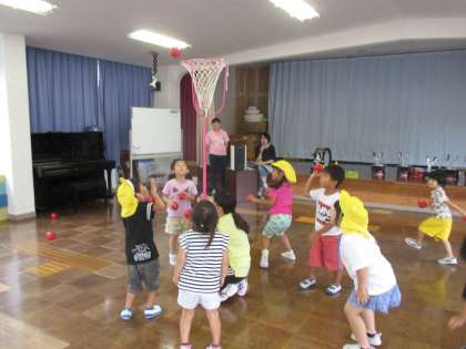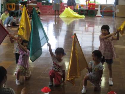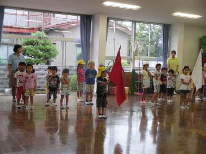 お互いにそれぞれの学年の種目を見合いっこしました。年下児にとってお兄さん・お姉さんたちのがんばる姿はとてもいい目標になりますが、年上児にとっても年下のお友達の憧れの目は、やる気の原動力になっています。当日まで子供たちがはりきって練習できるよう、お家のほうでもお話を聞いてみてくださいね。