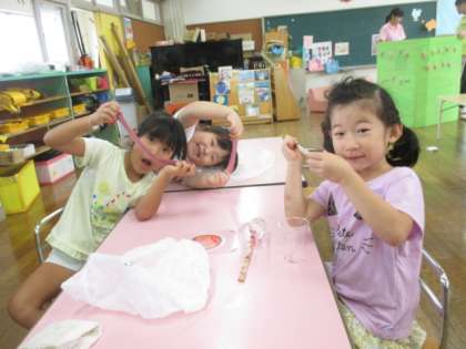 今日の午後から年長児が富山短期大学の実習生さんと一緒に、スライムづくりを楽しみました。