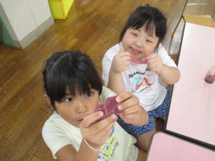 14時半以降の預かり保育の時間に年長さんのスライムを見た年中さんが「いいなあ・・」すると優しい年長さんは、一緒に使わせてくれました。スライムは洗濯のりでつくることができる楽しい遊びです。ぺたぺたひんやり、冷たい感触のスライムは子供たちに大人気。機会があれば、お家でもつくってみてはどうでしょうか。