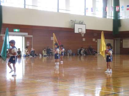 プログラム3番は4歳児ひまわり組のフラッグ「おどるポンポコリン」です。三色の旗が翻って、とても綺麗でした。