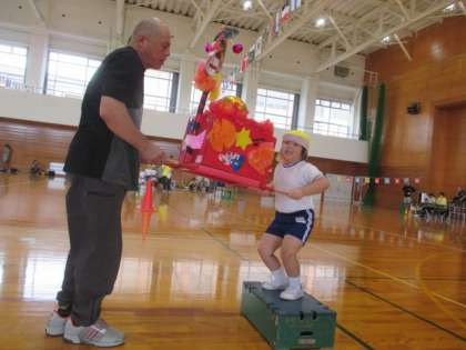 また、それと一緒に、今年の運動会は、春に5歳児さんが楽しんだお祭りごっこを、運動会のテーマとして掲げ、今までつくったり遊んだりしたことも取り入れました。子供たちのつくったお面や獅子が使われ、楽しい競争になっていましたよ。幼稚園を修了した小学生も参加してくれました。