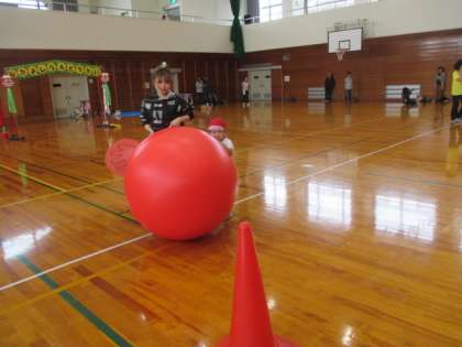 大玉ころがしでは、子供は一生懸命大玉を転がし、保護者は長い「手」をつかって軌道修正係。うまく息を合わせないとゴールを目指せませんが、大沢野の保護者はみんな息がぴったり!