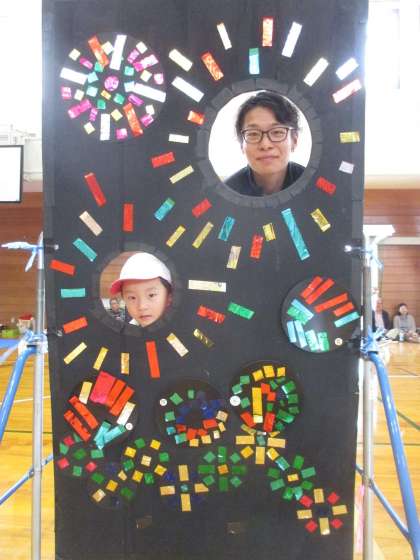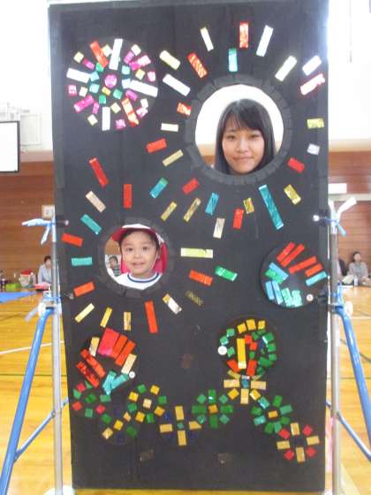3・4歳児親子の「獅子になってレッツゴー」は夜空にきれいな花火を咲かせる競技です。最後は花火の間から顔をのぞかせてパチリ。