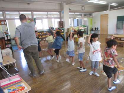 講師の先生と英語の歌を歌ったり、「sunny」「cloudy」など天気に関する英単語を教えてもらったりして楽しみました。