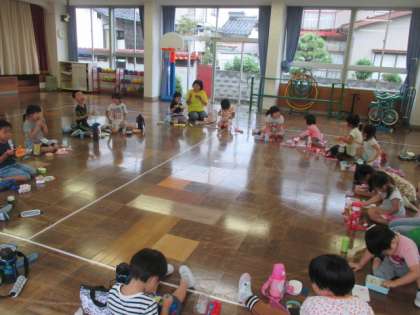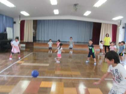 台風接近のため残念ながら遠足へは出かけられませんでしたが、遊戯室でドッジボールをしたり島鬼ごっこをしたりして元気に遊んだ子供たち。