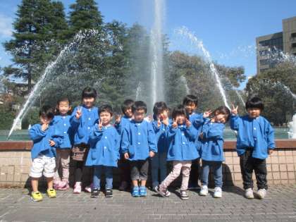 弁当を食べる前に、みんなで噴水と花時計の前で写真を撮りました。
