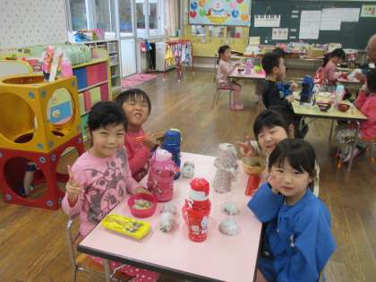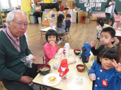 「いいにおいがする!」と出来上がるのを楽しみにしていた子供たち。お代わりをしてたくさん食べていました。おにぎりとサツマイモが入ったホットケーキもあってみんな大喜びでした。