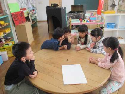 先日、5歳児のクラスでは話し合いが行われ、どんな劇を発表したいか、何が必要か子供同士で相談する姿が見られました。なかなか初めは話がまとまらず、お話し決めも悩みましたが、お互いの意見を聞きあい、気持ちを伝えあって決定しました。