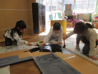 この日は劇に必要なものを決めて、みんなでつくり始めました。「牢屋、大きくしないと・・」とちょっと物騒な会話をしながら、一生懸命ぺたぺた。