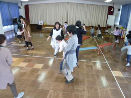 「とんぼのめがね」の曲に合わせて走ったり、止まったりとみんな歓声をあげて参加していました。