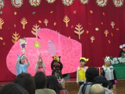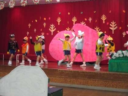 絵本で「てぶくろ」のお話を見て「てぶくろの中、楽しそうだね」「てぶくろごっこしたい!」と、すっかり物語が大好きになった子供たち。自分たちの好きな動物になりきって劇遊びを楽しんできました。「フィンガータップ」「フラフープ」「クイズ」も披露してぶくろの中に入っていきました。