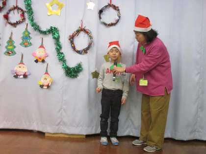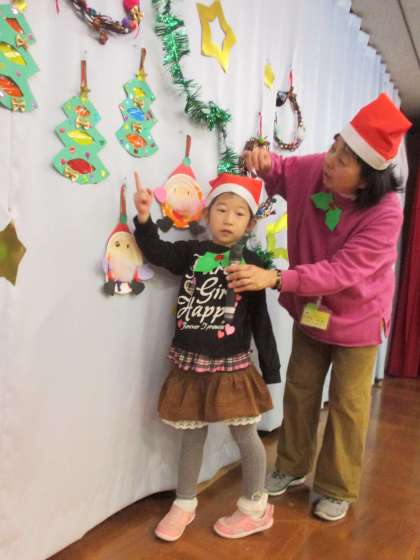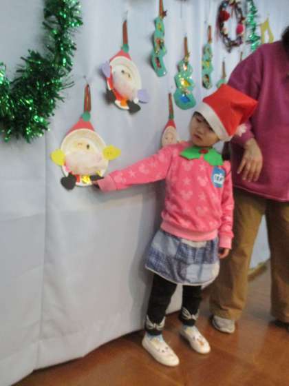 5歳児はリース、4歳児はツリー、3歳児はサンタクロースをつくって飾り、みんなに作品を紹介しました。