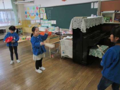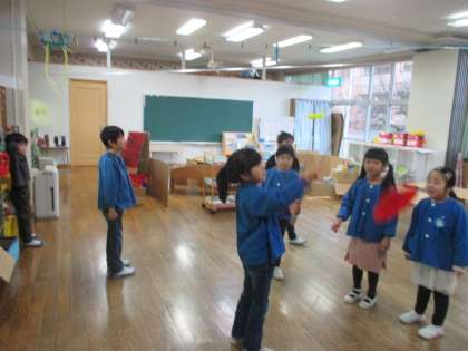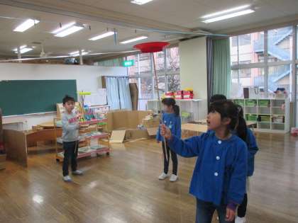 大人でもなかなか難しい皿回しを何度もチャレンジ。うまくバランスを取りながら棒の先で皿を回します。中にはそっと棒の先に乗せて、手で皿を回す子の姿も。(気持ちは伝わってきます・・) なかなかできず、あきらめないで挑戦する気持ちも、何気ない遊びの中で育っていけばと思っています。