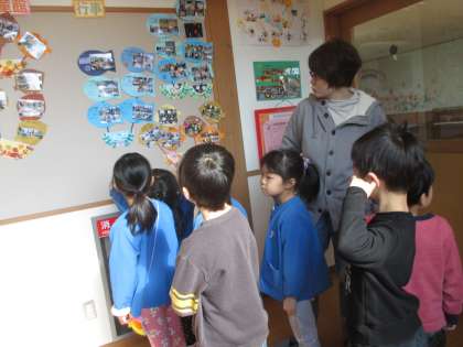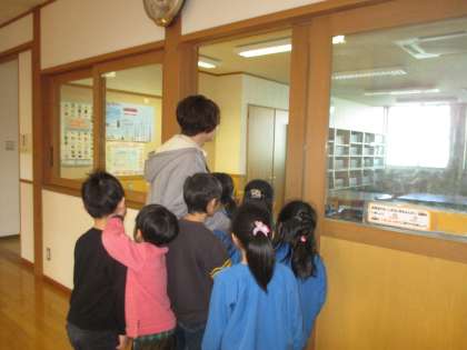 ドッヂボールをしようと思いましたが、今日はひまわりさん、たんぽぽさんも遊戯室でドッヂボールの特訓中。ということで、より広いコートを求めて、大沢野児童館に行ってきました。「児童館、あんまり入ったことないんだよね・・」と言う子供たちと、まずは児童館の中を見学させていただきました。児童館の先生にも案内をしてもらいましたよ。