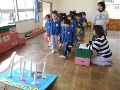 暖かな春の陽射しが降り注ぐ24日、もうすぐ修了する年長さんと一緒に、おわかれゲーム大会をしました。なかよしグループ(異年齢のグループ)の友達と一緒に、ボーリングやわなげ、運動遊びなどをするゲームコーナーで遊びました。年少、年中、年長の3人で仲良く力を合わせて回ってくることができました。