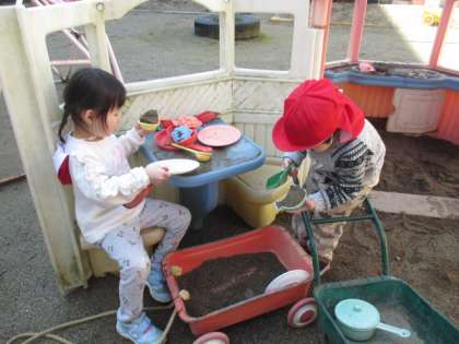 3歳児は砂遊びをしました。型に砂を入れてバナナケーキやクッキーをつくってお菓子屋さんをして楽しんでいました。