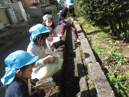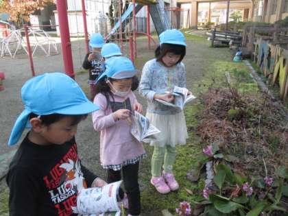 4歳児は図鑑を片手に春の動植物探しをしました。「葉っぱの形が面白いね」「花びらの数を数えてみよう」と友達同士で声を掛け合って楽しんでいました。