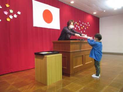 今日は3学期最後の日。たんぽぽ組とひまわり組の修了式がありました。先日行われたうさぎ組の修了式をよく見ていた子供たちは、名前を呼ばれると年長児のように「はい!」と元気に返事をして証書を受け取りました。一人一人が1年間でがんばったことや成長したことを担任が心を込めて言葉にした修了証書です。子供たちも嬉しそうに眺めていました。