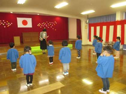 着任式では、新しい園長先生、担任の先生を迎えました。始業式では、園長先生から新しい名札を一人ずつ付けてもらい、進級した喜びを感じとても嬉しそうでした。子供たちがいろいろなことに挑戦し、楽しい園生活を送ることができるよう、職員一同力を合わせてまいります。保護者の皆様のご支援とご協力をよろしくお願いします。