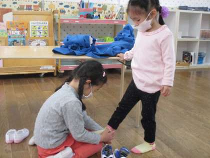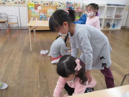 入園したばかりのたんぽぽ組(3歳児)は、うさぎ組(5歳児)に着脱を手伝ってもらって嬉しそうにしていました。「靴を脱いで靴下を脱ぐよ」「一緒に脱いでみよう」と優しく声を掛けながらたんぽぽ組さんを手伝ううさぎ組さんが頼もしかったです。