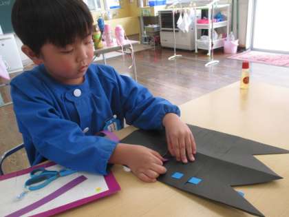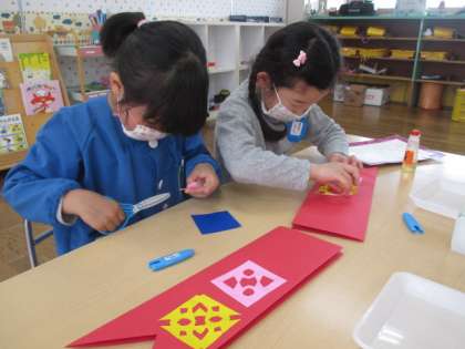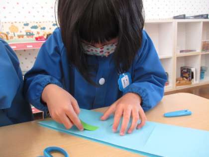 少し早めのこいのぼり製作をしました。お父さんこいのぼりは編み込みで、お母さんこいのぼりは折り紙を使って切り紙をしました。「上から編んでいったから次は下からだ」と編み込みをすることに真剣な表情が見られたり「お母さんだからハートの模様にしよう」とうろこの模様を工夫したりしてつくっていました。