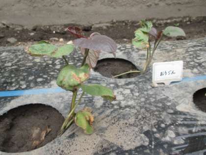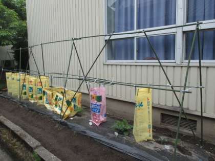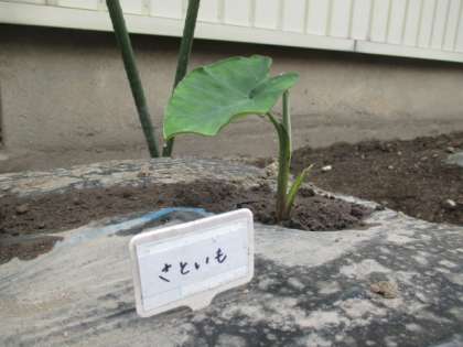 先週植えたサツマイモや里芋等が大きくなってきましたよ。毎日水をたくさんあげて成長を見守ってきました。風よけの囲いをつけたり、大きく成長した時のための支柱を立てたりしました。