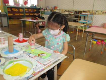 とても遅くなりましたが、鯉のぼりに丸や三角でいろいろな色のスタンプを押して遊びました。明日、お家に持って帰りますね。お楽しみに。